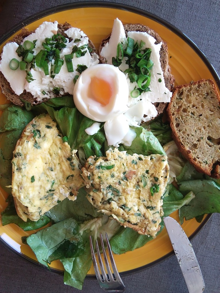 Une assiette gourmande, fraîche et printanière composée de tartines de ricotta parsemées d’herbes fraîches, un reste de cake, un avocat si vous en avez, un œuf mollet et une petite part d’omelette aux herbes et à la ricotta, sur lit de salade…