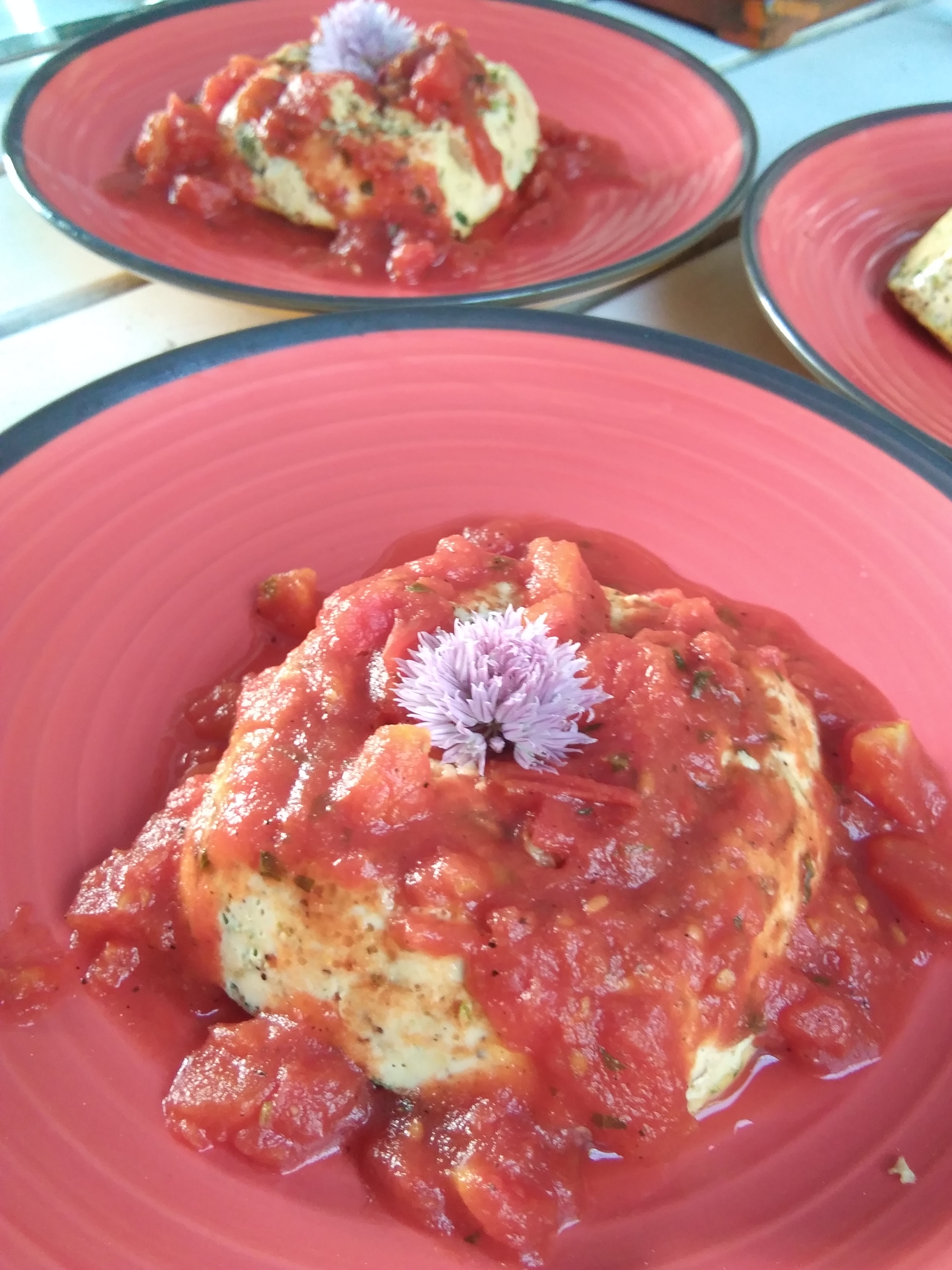 Démouler les flans dans les assiettes, les entourer de coulis de tomates tiédi et décorer avec une feuille de basilic ou 2 tiges de ciboulette…