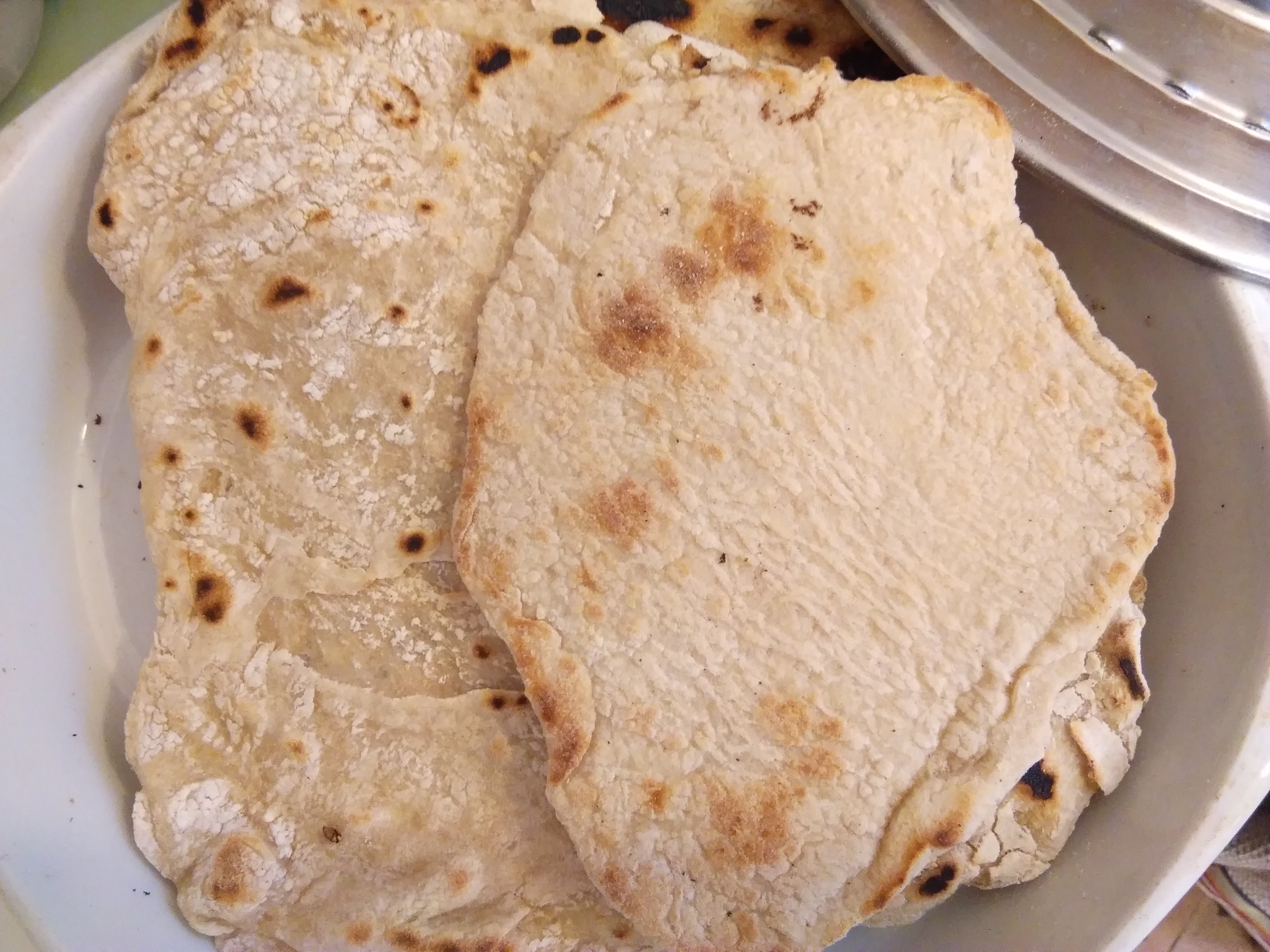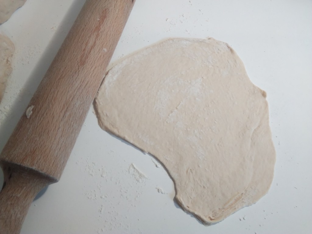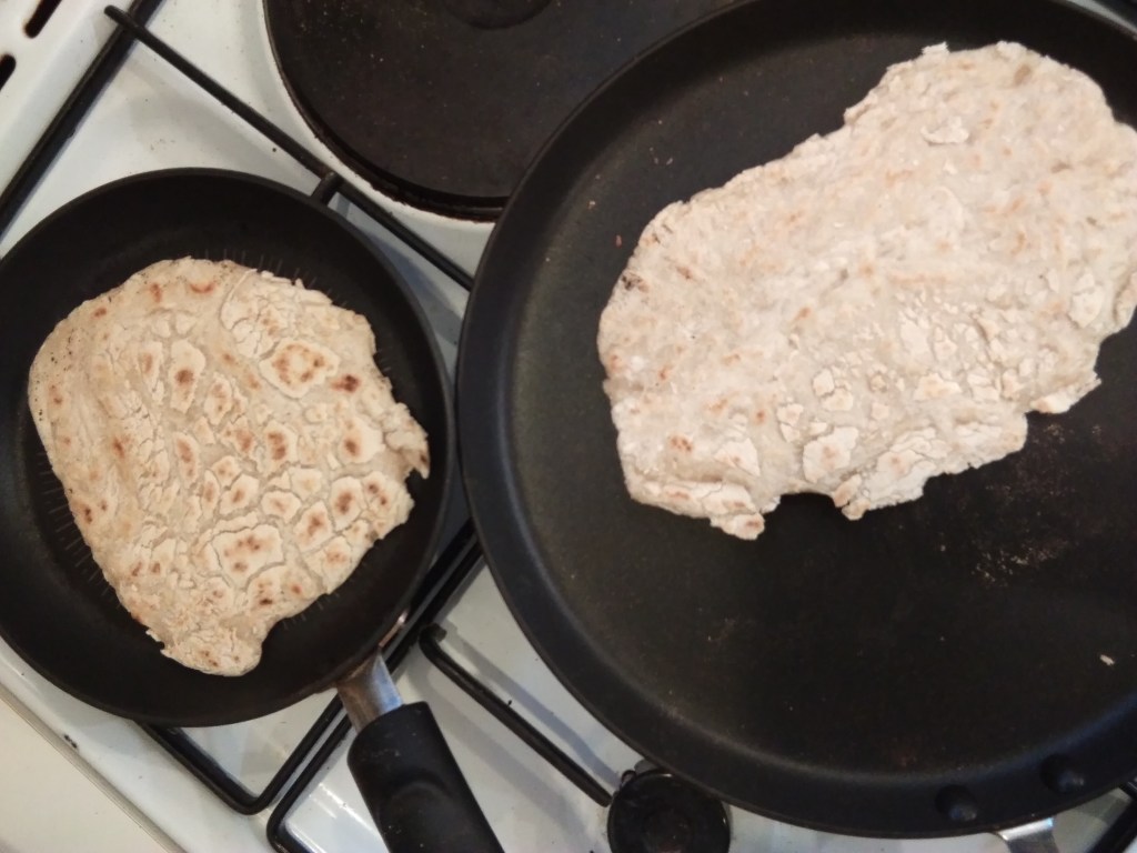 Étaler chaque boule au rouleau et faire cuire à la poêle, de préférence antiadhésive, quelques minutes de chaque côté. Elles gonflent un peu et doivent être dorées.