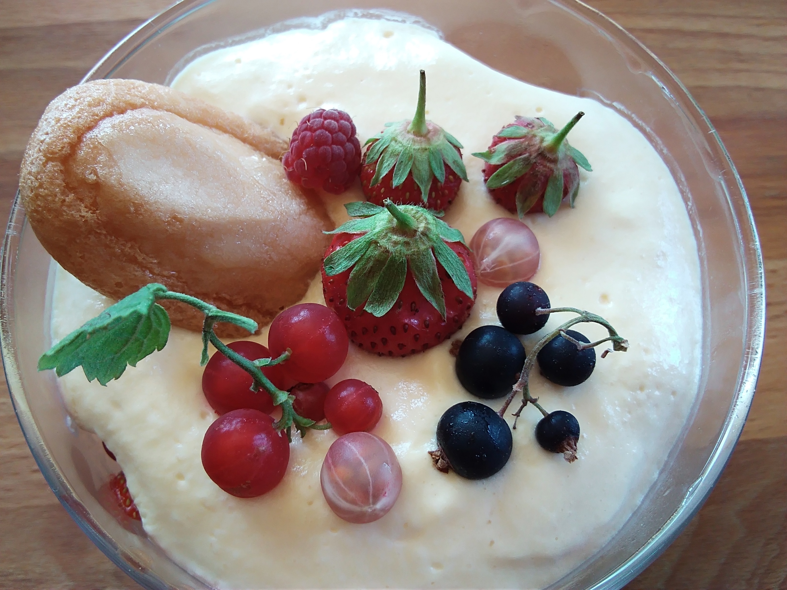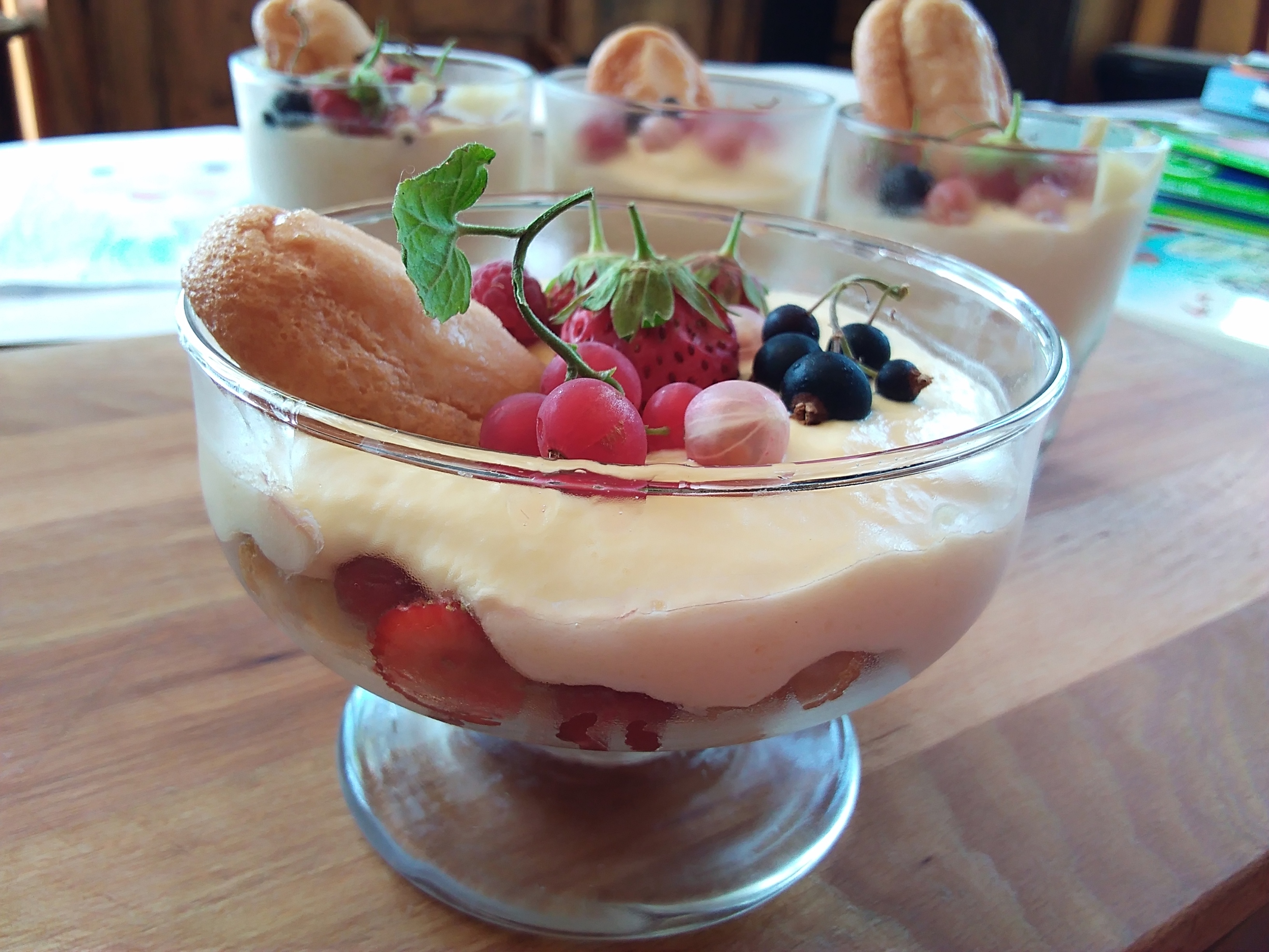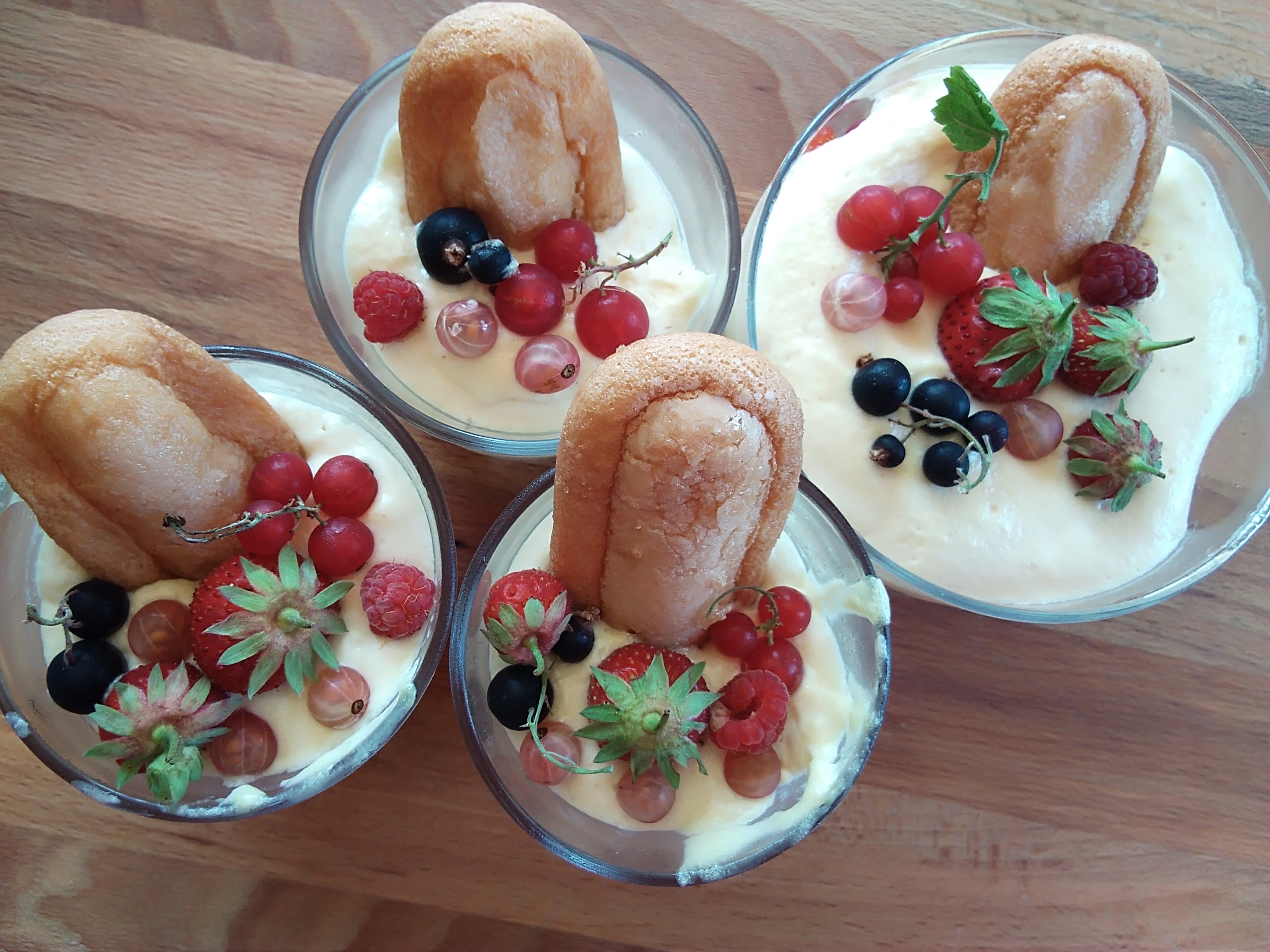 On peut tremper encore des biscuits et les disposer sur la crème, pour la déco, et parsemer de fruits rouges…