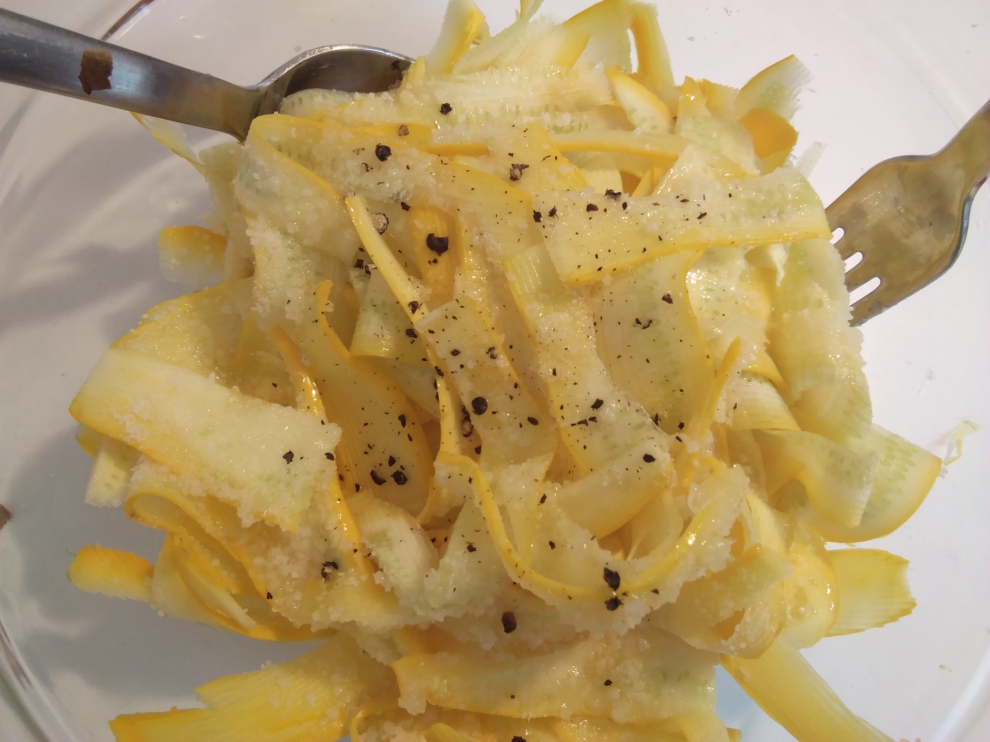 Je republie cette recette fraîche et légère, actualisée, très adaptée à la chaleur estivale actuelle. À faire avec de très jeunes courgettes, récemment cueillies…. Ici, les courgettes « Jaunes » de Mélanie Castel, à Collongues, et l’ail du jardin de Cassias… 1 petite courgette par personneun peu d’ailun peu de parmesanun peu de jus de citron1 cuillère d’huile d’oliveun peu de poivre