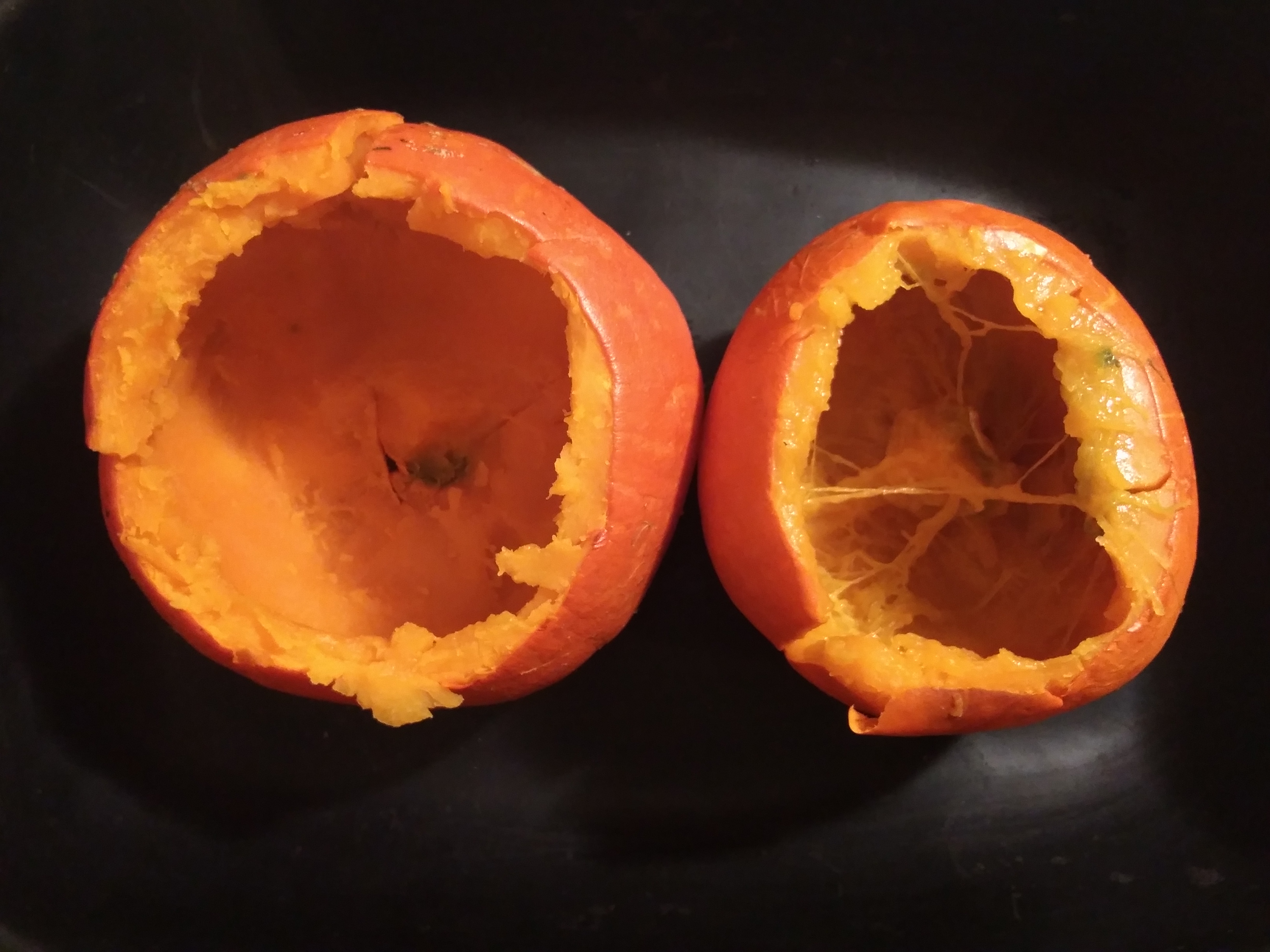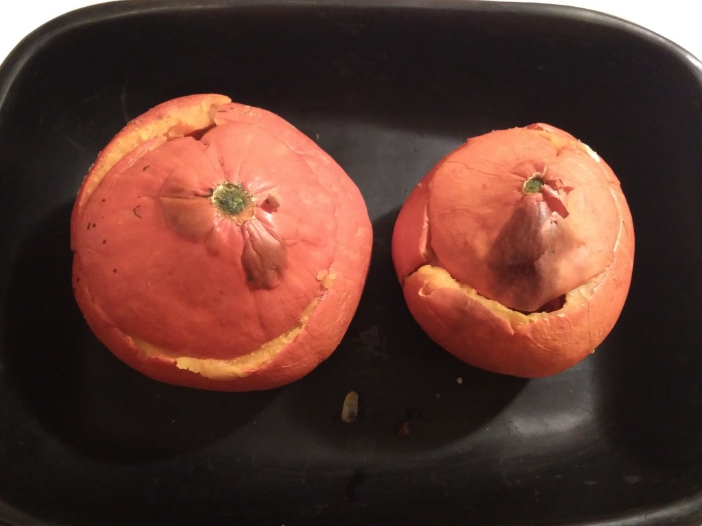 Lorsque les potimarrons sont cuits, découper leurs chapeaux et les vider de leurs graines. Gratter un peu la chair à l’intérieur mais pas trop pour ne pas qu’ils s’affaissent.