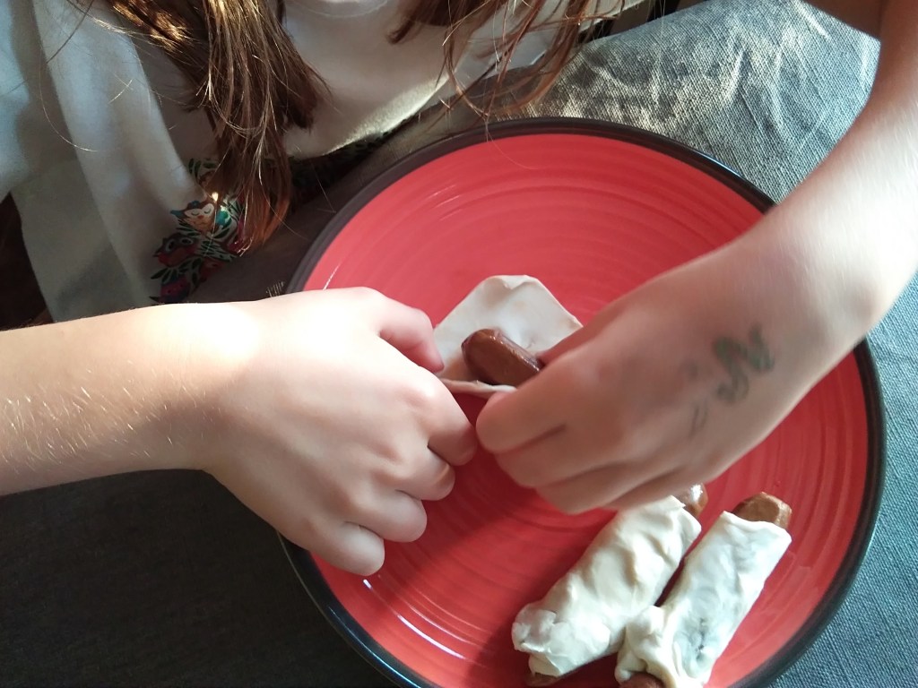 Enrouler la pâte autour des tronçons de saucisses en les laissant dépasser à une extrémité du « doigt « .