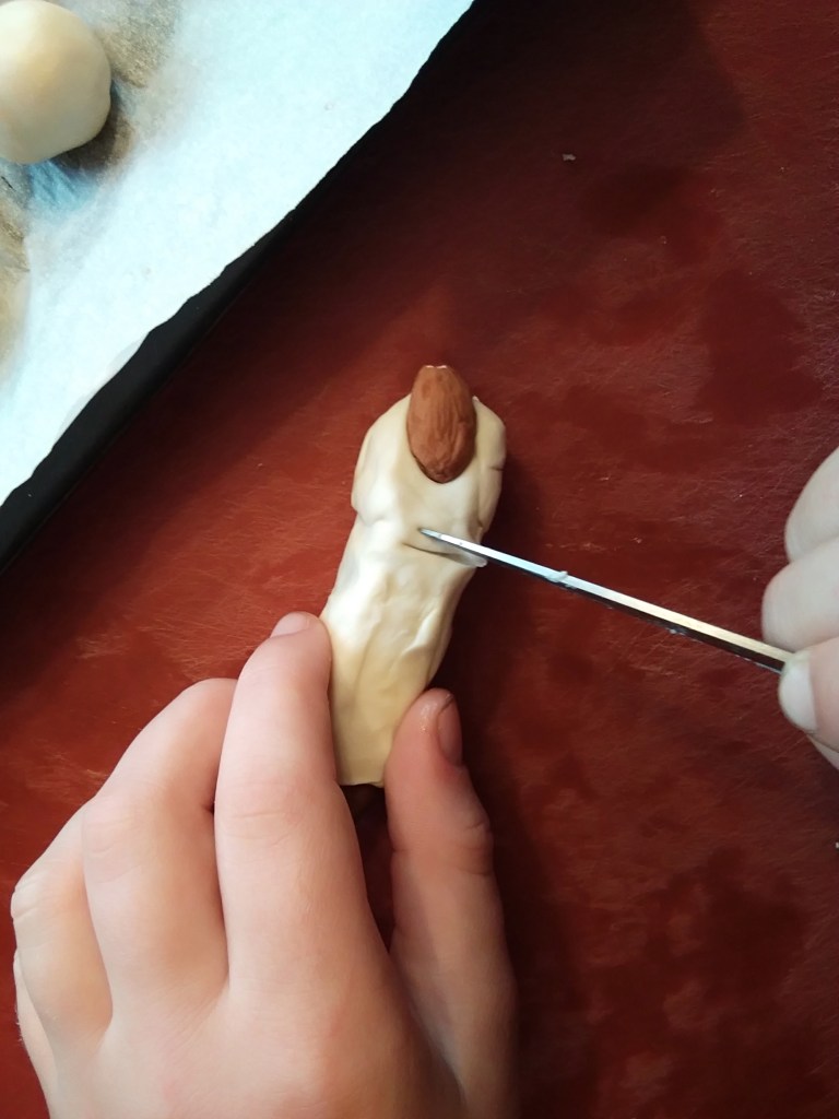 Fixer une amande au bout du doigt pour faire l’ongle. Il faut appuyer un peu fort pour qu’elle tienne à la cuisson…