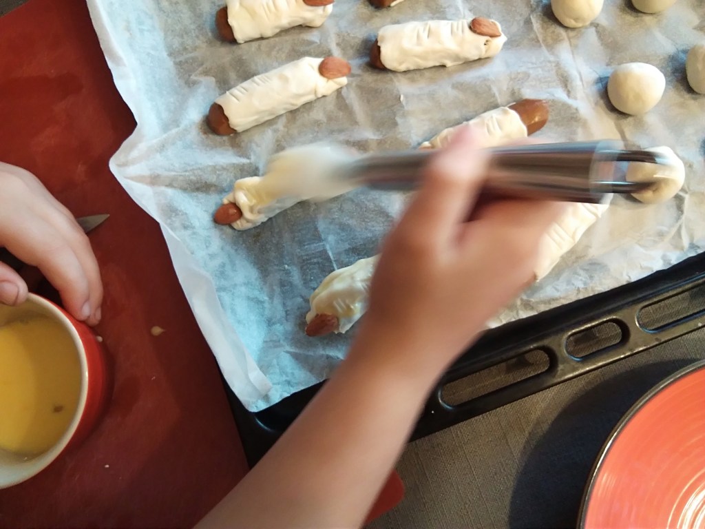 Déposer les doigts sur une plaque beurrée, faire quelques striures au couteau au niveau des phalanges et badigeonner du mélange jaune d’œuf et lait pour dorer.
