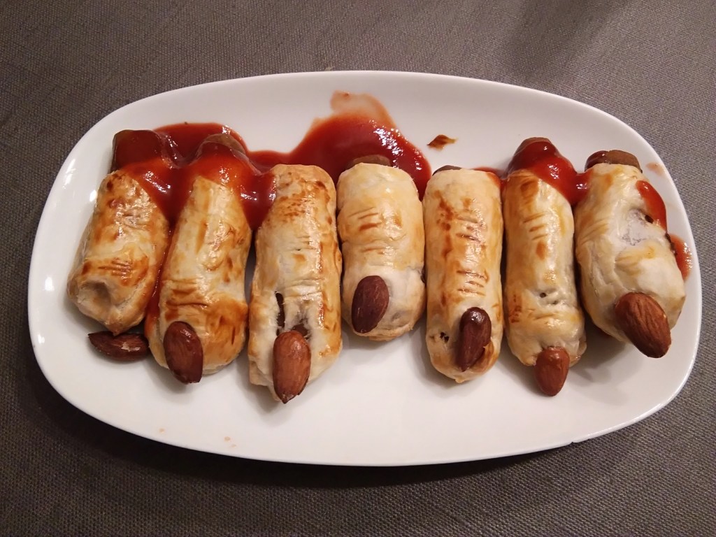 Déposer dans le plat de présentation et mettre du ketchup aux extrémités pour faire…saignant !!! Beurk.