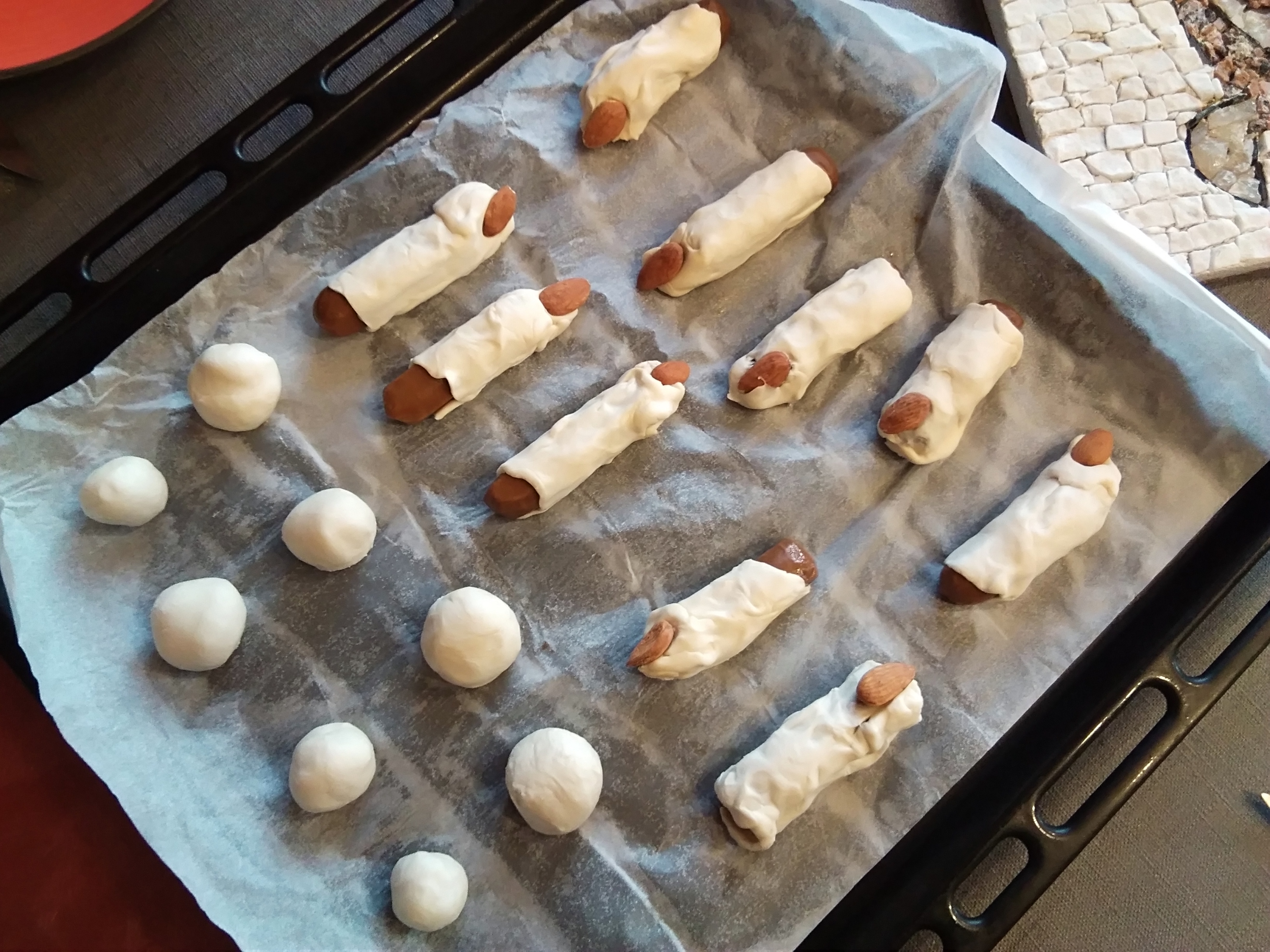 Déposer les doigts sur une plaque beurrée, faire quelques striures au couteau au niveau des phalanges et badigeonner du mélange jaune d’œuf et lait pour dorer.