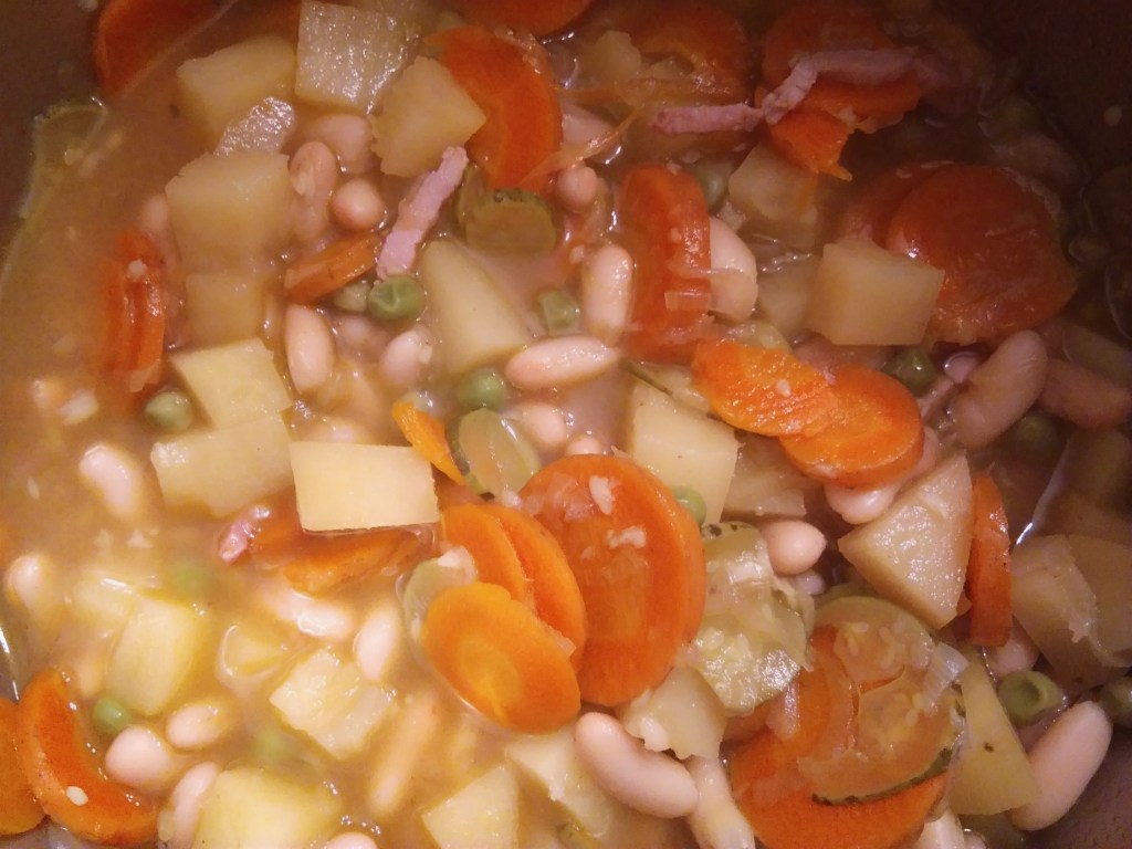 Les légumes sont donnés à titre indicatif, car c’est selon ce que vous trouverez dans votre potager ou sur le marché. Le principe étant d’y mettre des haricots, des légumes en morceaux et quelques feuilles de saison.