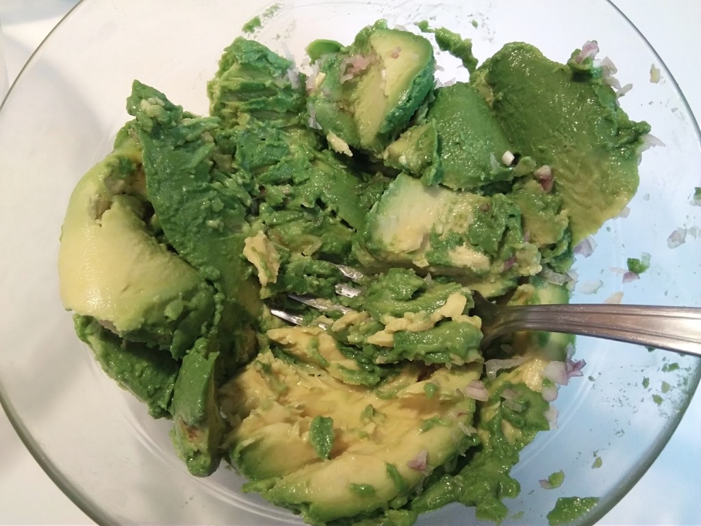 Ajouter le jus de citron progressivement jusqu’à obtention de la consistance désirée. Petite précision: le guacamole doit pouvoir être tartiné, et doit être écrasé de façon non homogène. C’est pourquoi je n’utilise pas de mixeur, même quand j’en fais une belle quantité .