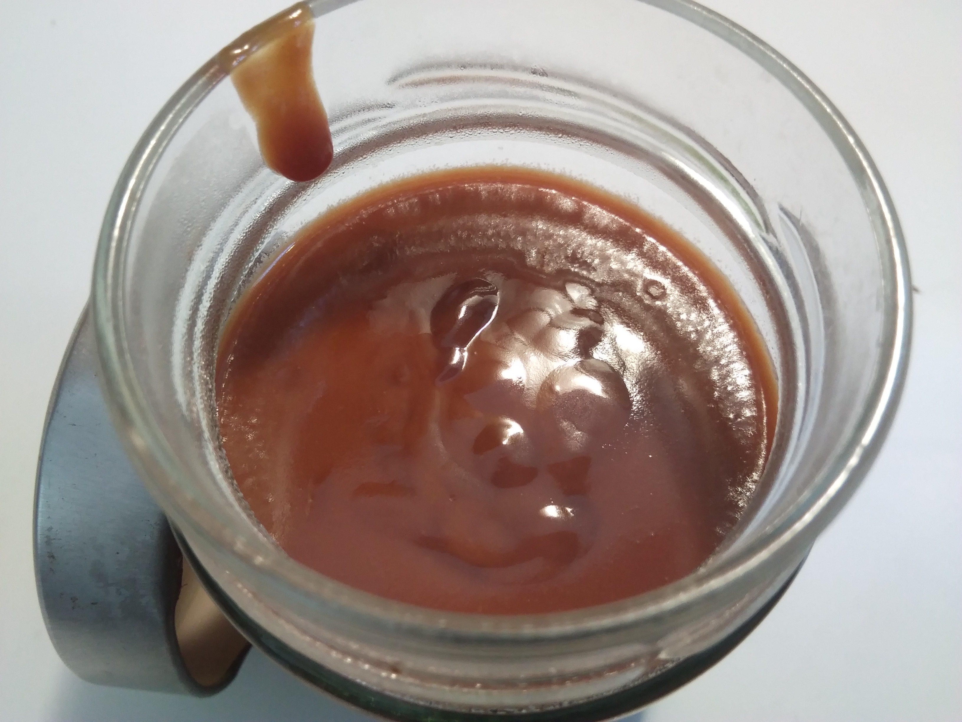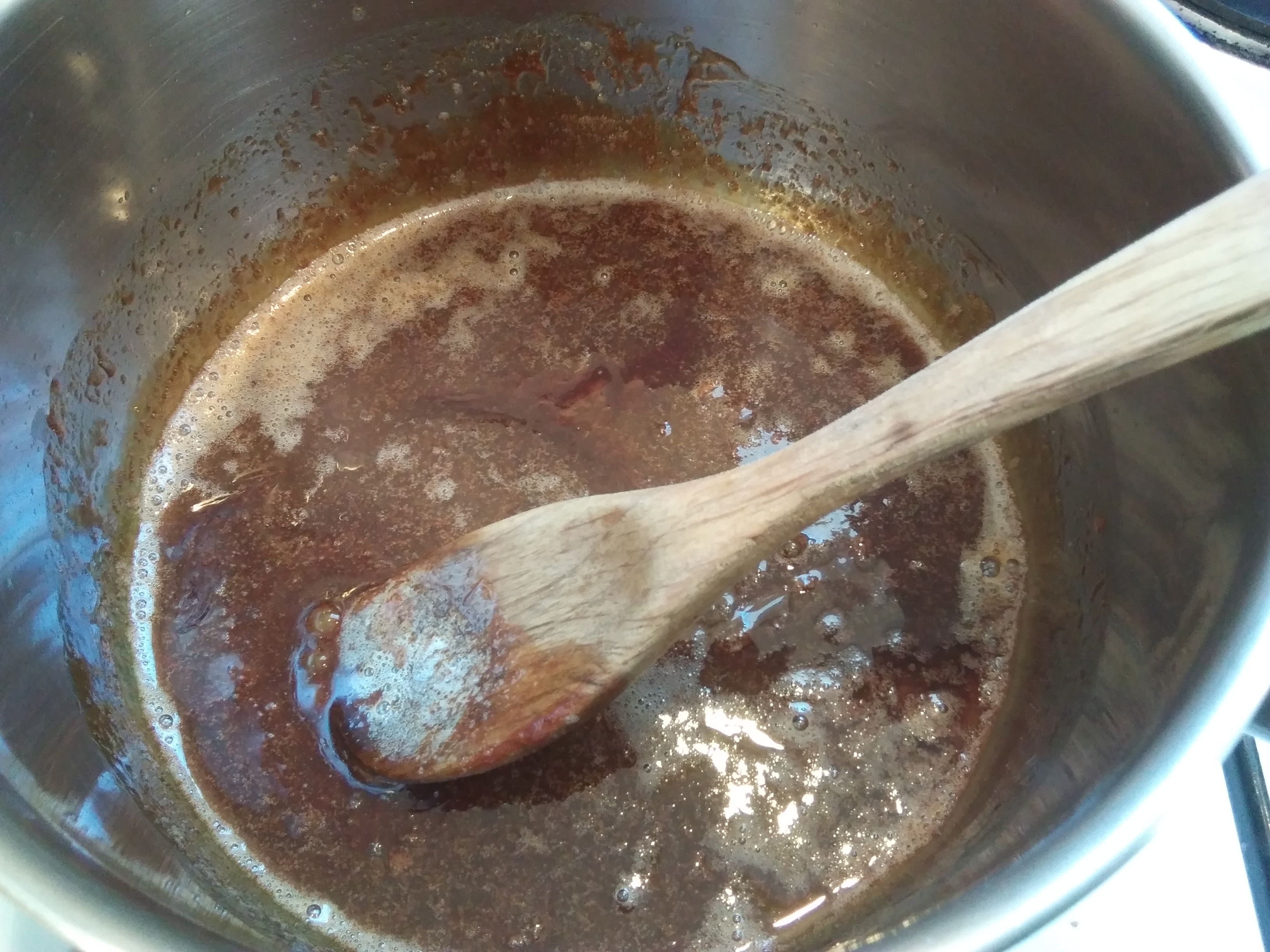 Quand il devient liquide et couleur ambre, retirer la casserole du feu et ajouter d’un coup le beurre. Bien remuer en même temps qu’il fond, et ajouter rapidement la crème. Mélanger jusqu’à ce que ce soit bien crémeux et onctueux puis remettre sur feu doux.