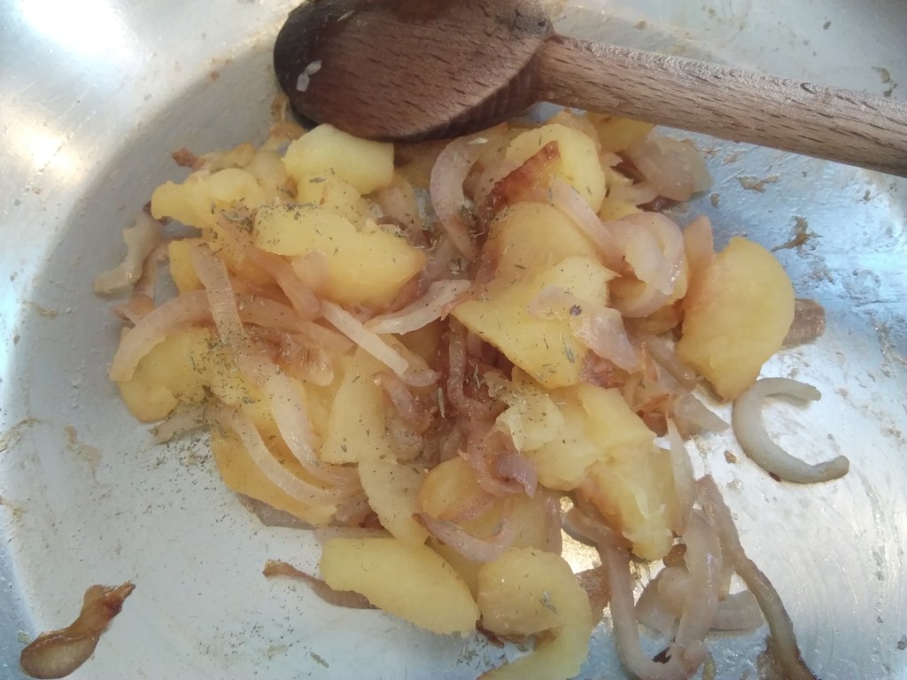 Quand les pommes sont tendres et que les oignons commencent à dorer, ajouter le thym et le vinaigre.