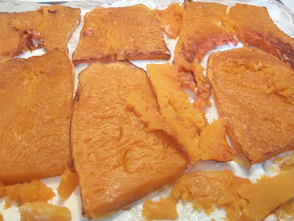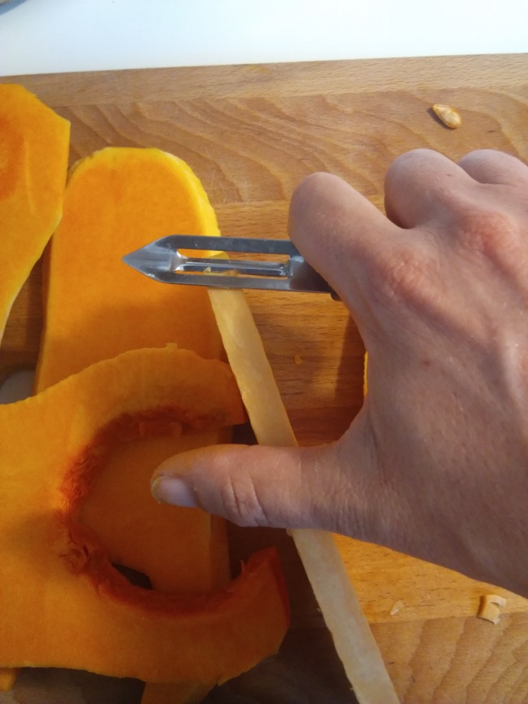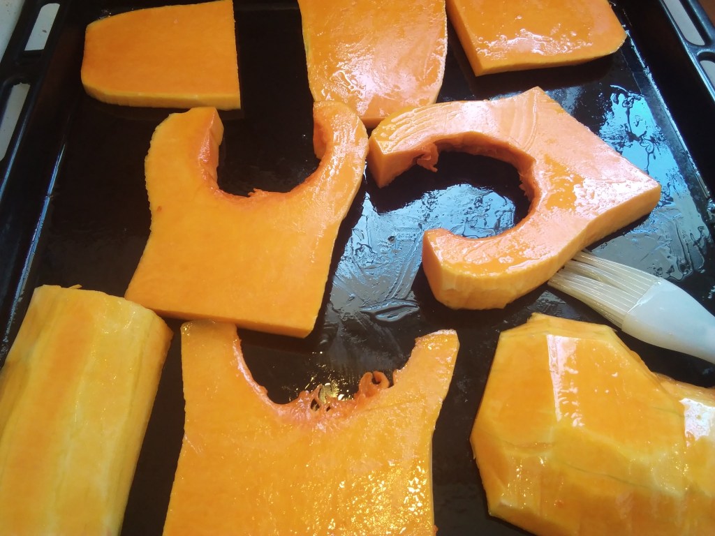 Peler la courge et la couper en tranches d’un demi cm. Les badigeonner d’huile d’olive. Mettre au four à 180°C pendant 20 minutes en les retournant à mi-cuisson.