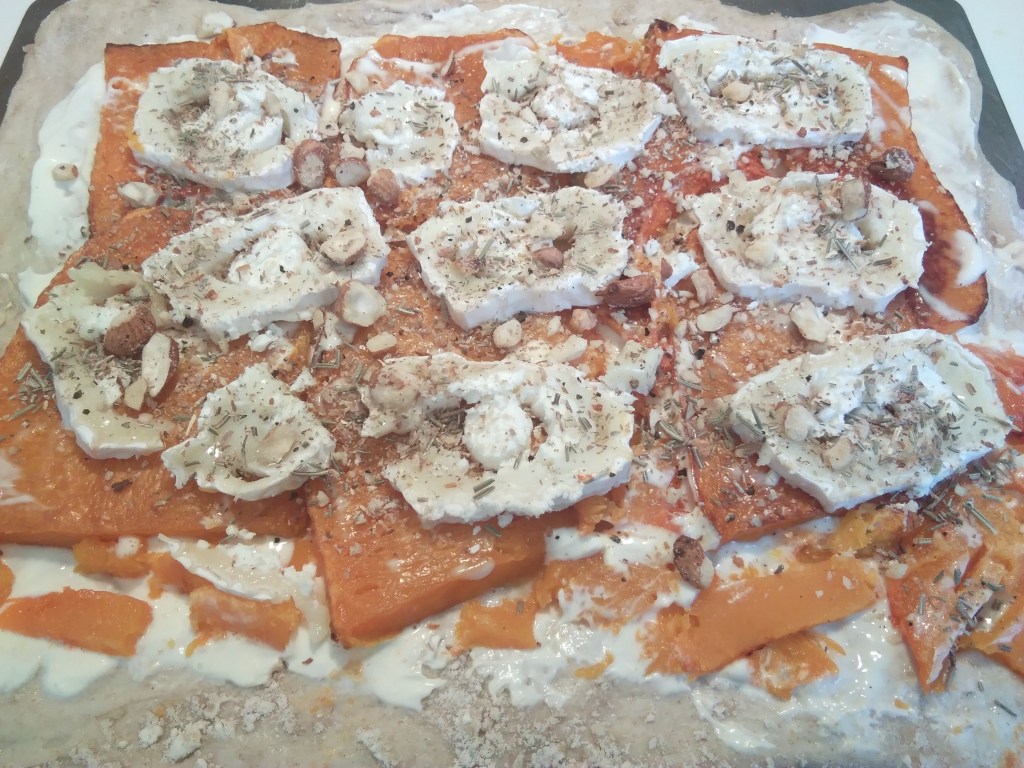 Étaler la pâte à pizza sur une plaque de cuisson, la couvrir de crème fraîche épaisse et poser les tranches de Butternut cuites par-dessus.