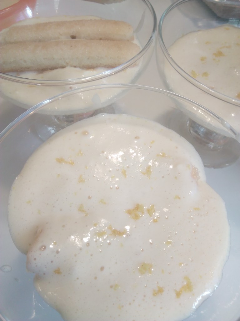 Battre les jaunes avec le sucre jusqu’à ce que le mélange blanchisse et ajouter le mascarpone. Mélanger puis incorporer délicatement les blancs. Réserver au réfrigérateur.