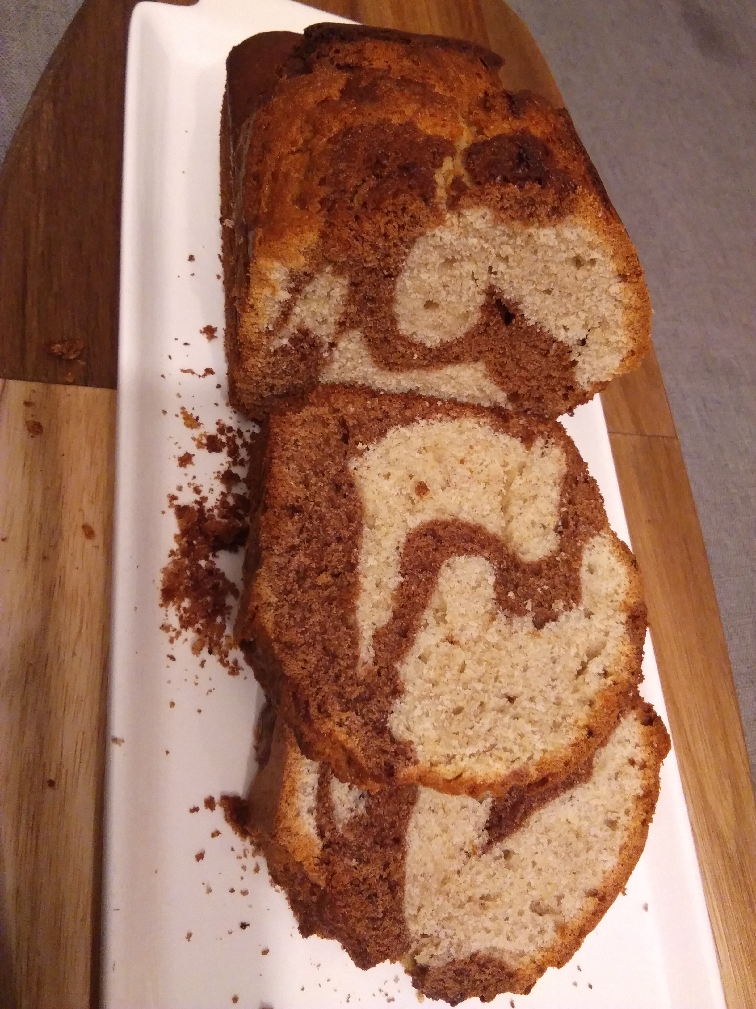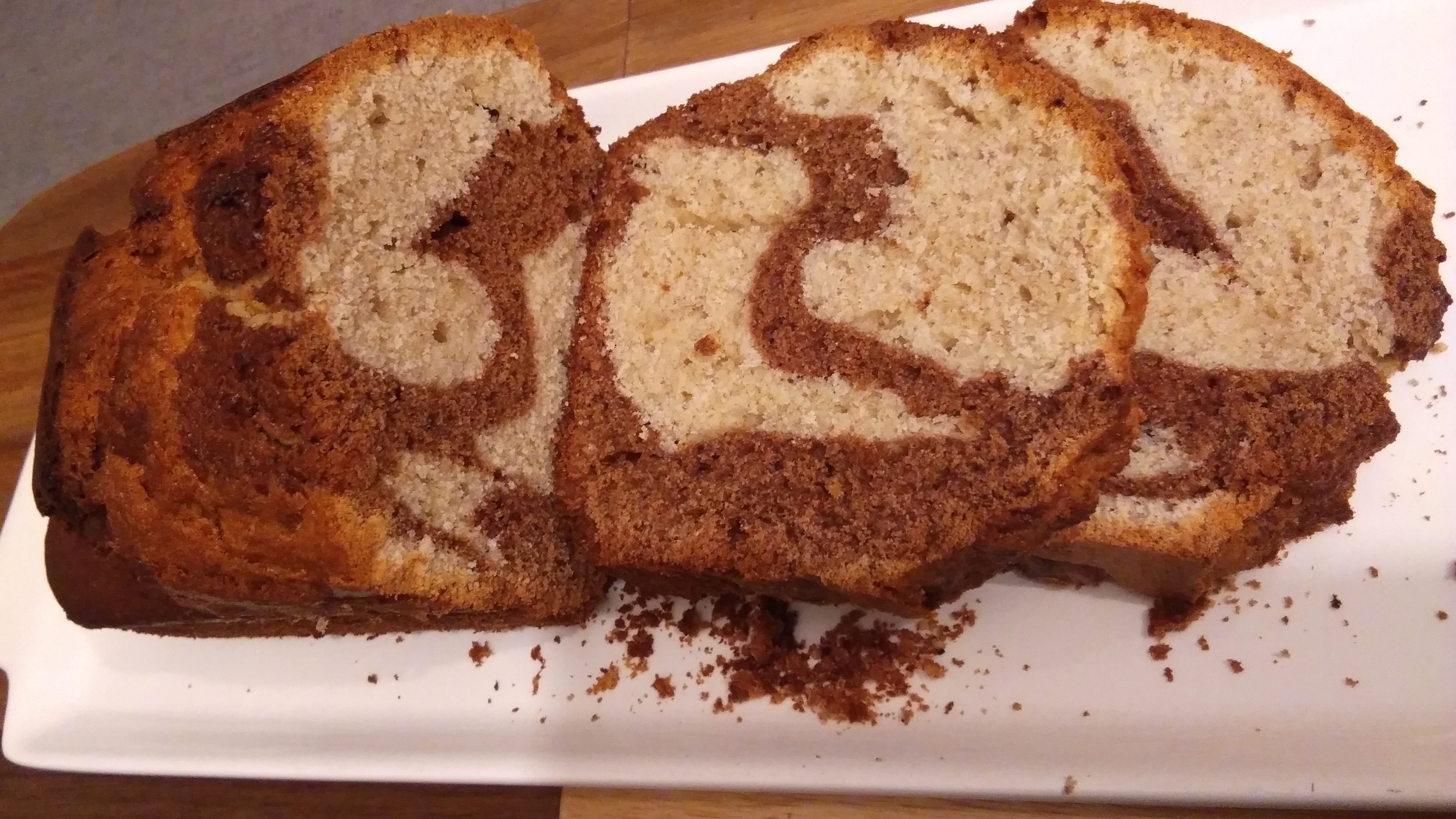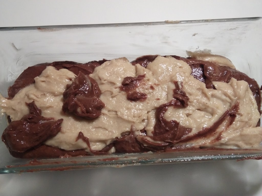 Dans un moule à cheminée idéalement, ou un moule à cake beurré, mettre 1 grande cuillère de pâte chocolatée, puis une autre de pâte nature, et alterner ainsi les couches de pâtes, sans les mélanger.